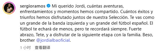 拉莫斯社媒写道:“我亲爱的约迪,我们一起经历了多少冒险、对抗以及精彩的时刻。 我们一起在国家队经历了多少胜利和荣誉。 足球世界会想念你,而且永远会记得你。我想好好拥抱你,和家人一起享受人生的下一个阶段吧。吻你,兄弟。”